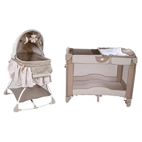The Bassinet can be attached inside the Play Yard and will gently rock when the baby moves. The bassinet can also be removed and attached to a pedestal that rocks, rolls, or remains stationary. the Diaper Changing Station is acctached to the side of the play yard. To use, just flip the diaper pad over the side of the rail to rest on the top of the play yard. To store, flip the diaper pad back over the side of the rail to reveal clever storage pockets located on the opposite end of the play yard. The play yard is also equipped with music, lights and a vibration mechanism to soothe the baby. The play yard and bassinet can be folded and stored in the storage bags of convenient travel.