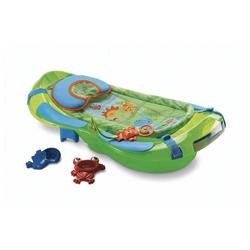 Appropriate for use for newborn, infant, and older infant/toddler! The Fisher-Price Rainforest Bath Center brings a comfortable bath time experience to both baby and mom. The Bath Center can be used for a newborn, an infant and an older infant or toddler . This very fresh looking translucent tub has a wonderful bolstered soft sling with a separate head support cradles newborns, then detaches from one end to lie over the small end of the tub as a pad for more active babies . When baby can sit up alone, the large end of the tub provides just the right sized tub for lots of fun play. Soft cushions along the upper lip of the tub give parents 4 comfortable resting spots for their arms and wrists. The tub comes with 3 Rainforest themed toys: a toucan water sifter, frog pouring cup, and a monkey teether toy for lots of fun in the tub! Product Dimensions: 30.9 x 18.5 x 8.8 inches Weight: 3.7 pounds
